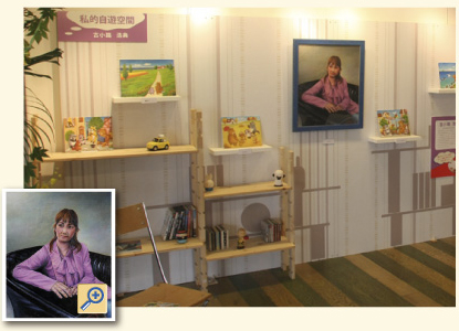 私のスペースでは、お気に入りの絵本やコミック、DVDなども展示。私らしい空間が演出できたと思っています。今回は、メルヘンなイラストとシリアスな女性の肖像画を同時進行で制作しました。違う世界をいったり来たりしながら描くのも楽しいですよ。ちなみに、絵の女性は近所の自立支援NPOのスタッフです。女性の柔らかい感じを描きたいと思い、モデルをお願いしました。